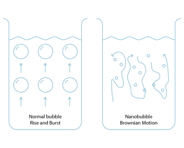 Nanobubbles are neutrally buoyant and can remain suspended in liquid for months and due to the Brownian Motion will travel randomly throughout the body of water. This unique behavior enables nanobubbles to provide a homogeneous distribution of gas throughout the water column and efficiently aerate the entire body of water.